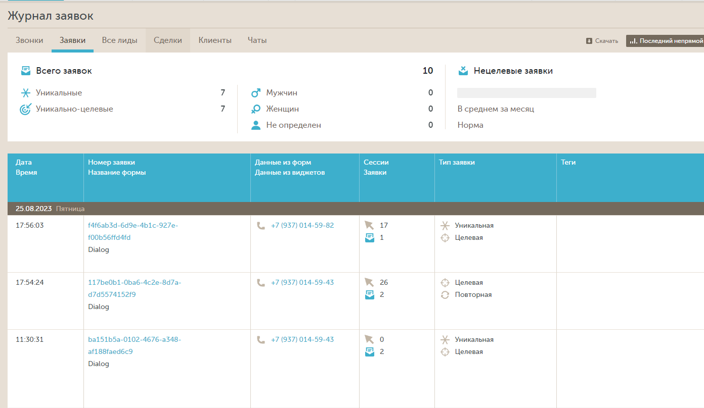 Результат интеграции вы увидите на вкладке «Журнал заявок» в личном кабинете Calltouch: