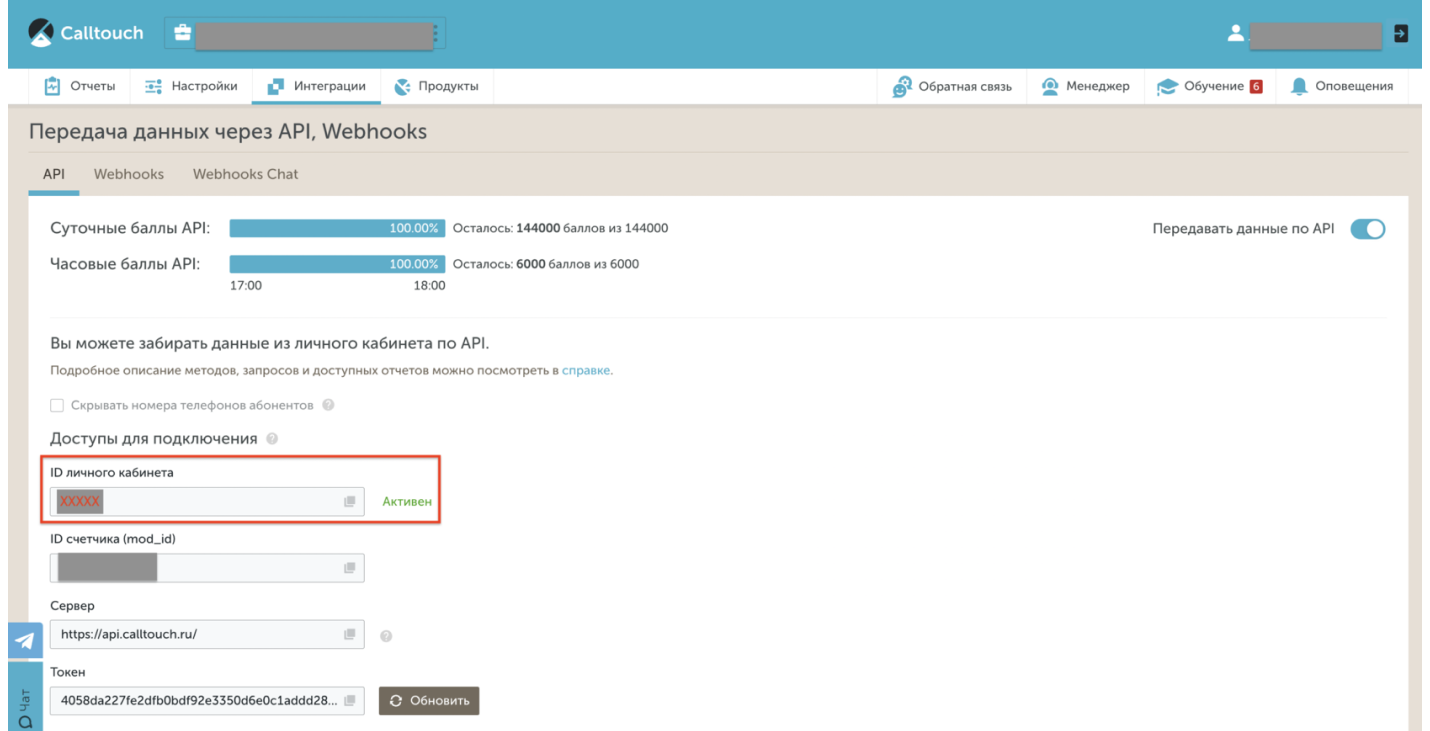 Скопируйте ID Личного Кабинета Calltouch из этого раздела и вставьте его в нужное поле в личном кабинете Yourgood.Widget (раздел «Интеграции»)