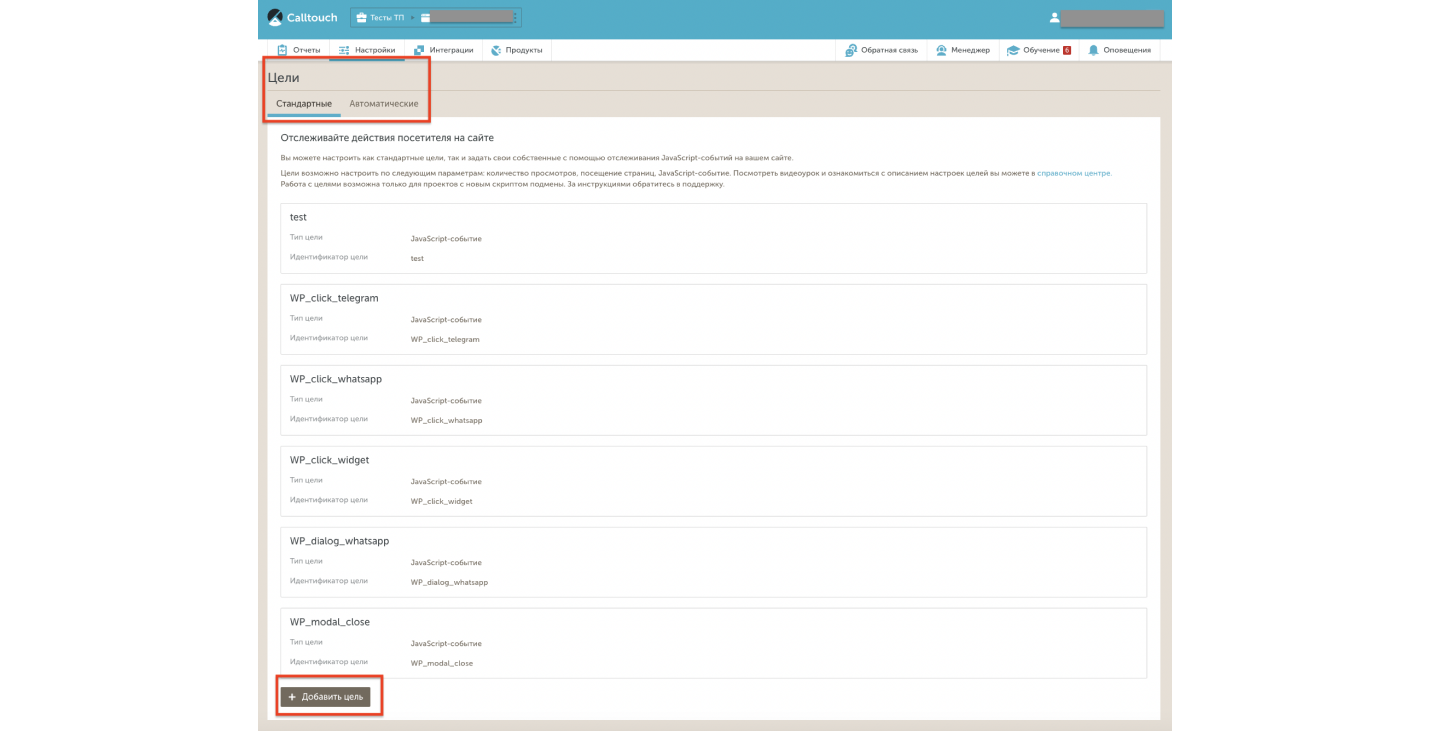 Чтобы настроить отображение действий с виджетом в личном кабинете Calltouch нужно добавить JavaScript-события в цели.