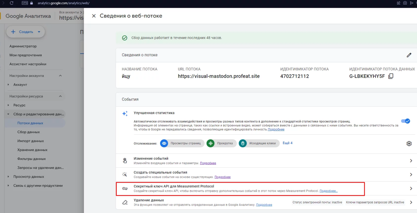 1. Открываем страницу Сведения о веб-потоке. Настройка Секретный ключ API для Measurement Protocol. Копируем оттуда значение секретного ключа (API ключ).