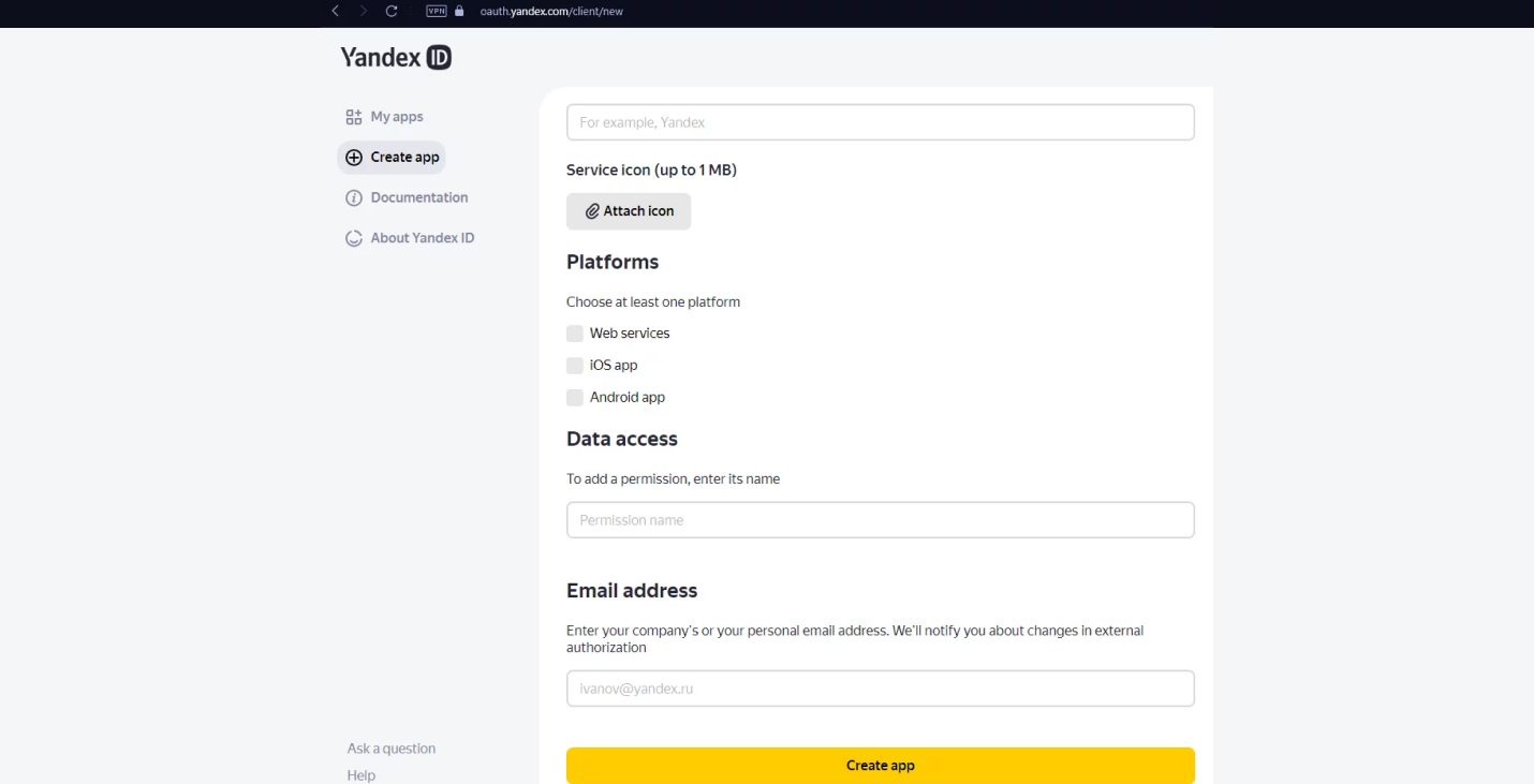 1. Открываем сайт https://oauth.yandex.com/client/new