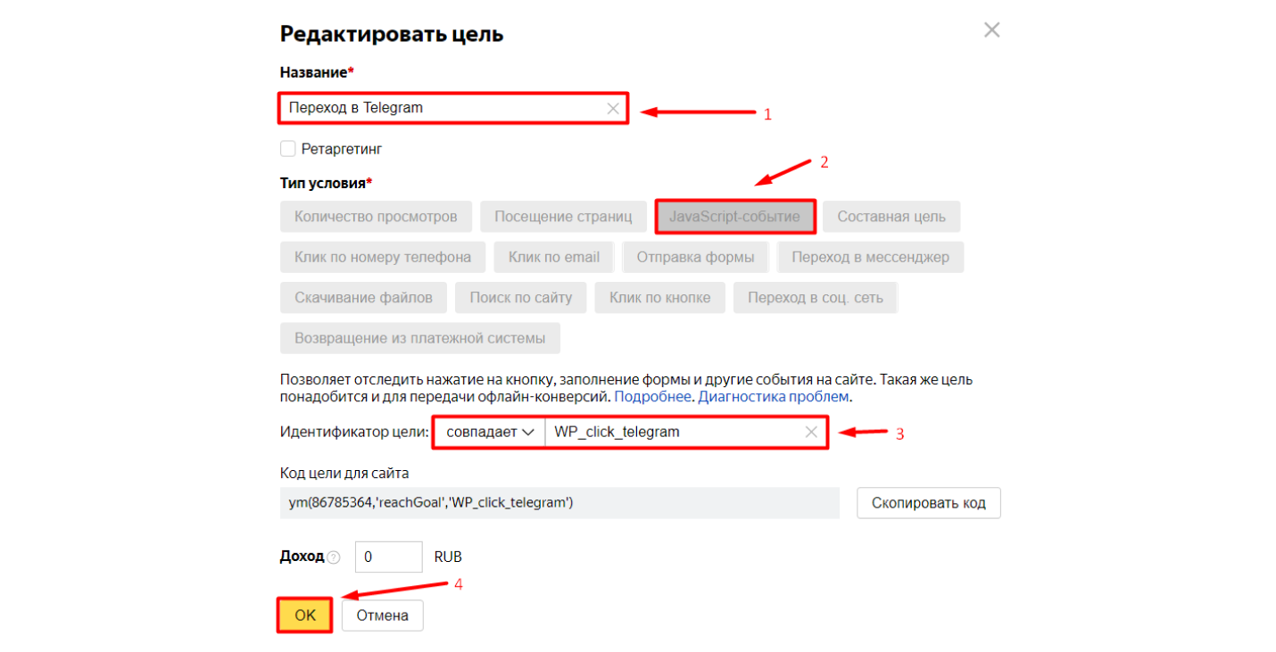 - Введите название цели и выберите тип условия «JavaScript-событие». Идентификаторы целей — ссылка.