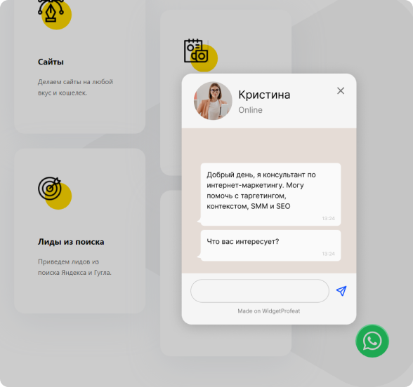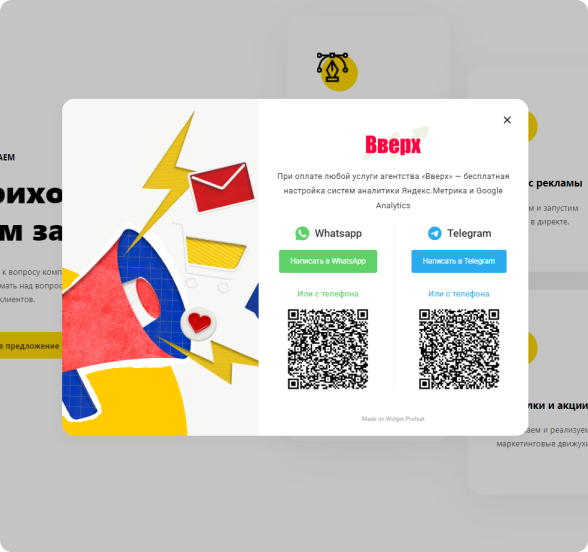 В момент, когда посетитель тянется к крестику, чтобы закрыть сайт появляется наш виджет и предлагает написать в мессенджер и получить скидку. Этот виджет задерживает посетителя и подталкивает его к совершению нужного действия!