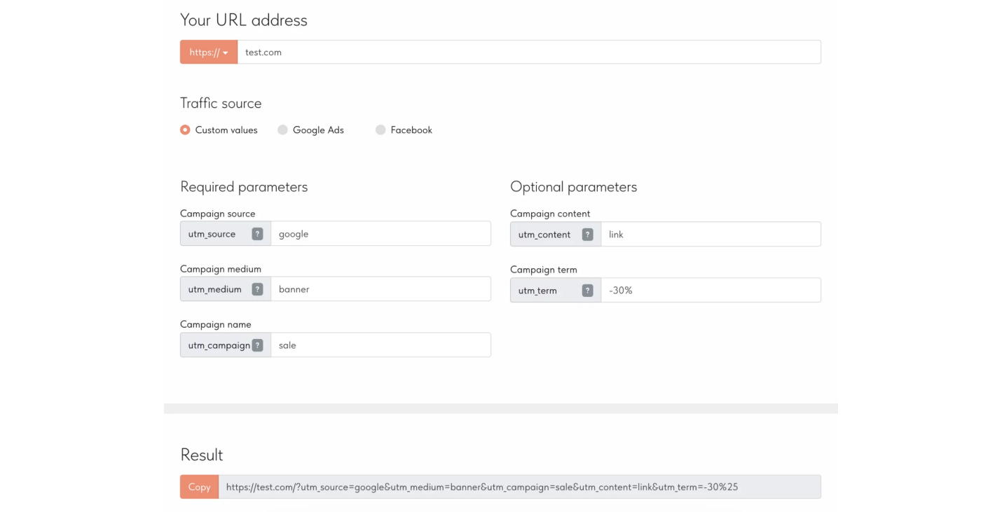 https://test.com/?utm_source=google &utm_medium= banner&utm_campaign=sale&utm_content=link&utm_term= -30%25… которую вы можете использовать в рекламном объявлении.